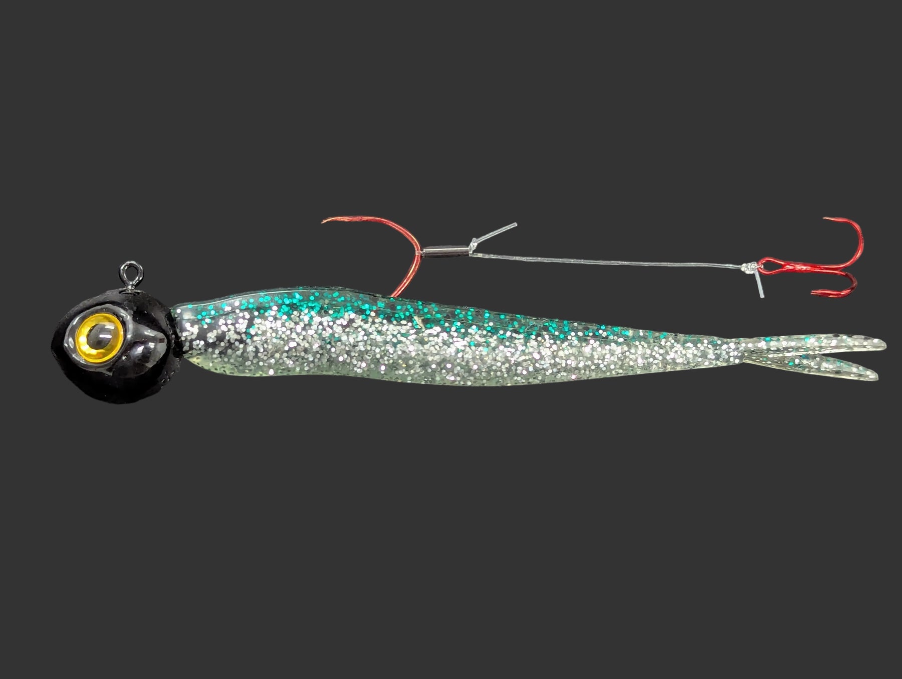 Some images show the stinger hooks paired with a walleye jig/split tail minnow. Some images show the stinger hooks paired with one of our stinger storage boxes. These images are for reference only, jigs/minnows/boxes sold separately.
