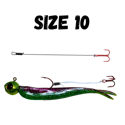 At 2.5'' long these match up great with hair jigs, split tails and most popular walleye jigs. Just place the loop over the jig hook and pull tight! Remove by sliding the black tube down. Easy on, easy off! The Mustad size 10 hooks are a much finer wire hook when compared to the size 8 version. The light wire of the size 10 hooks allows the hooks to bend out and make it easier to remove jigs from snags. The size 8 are stiffer/heavier wire hooks and are better when targeting larger fish. If you fish systems with bigger walleye in them, we suggest the size 8.